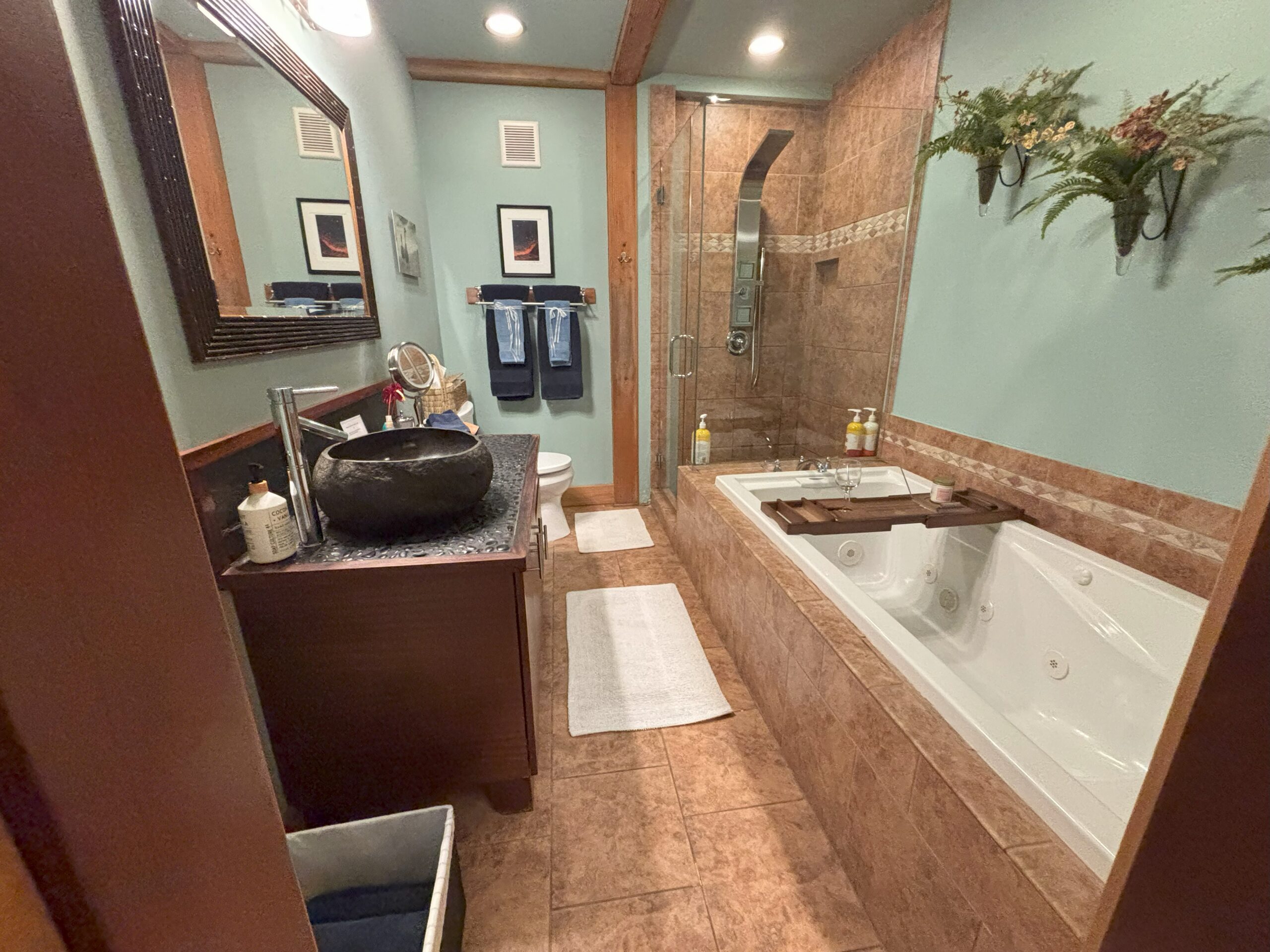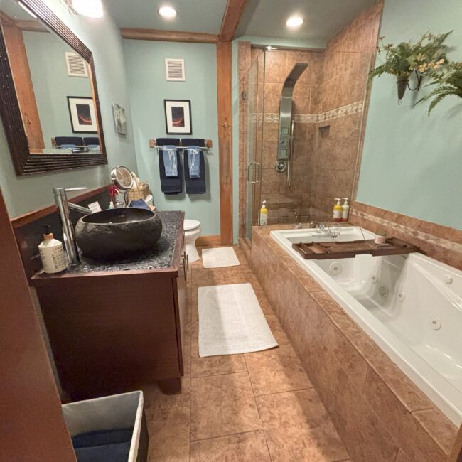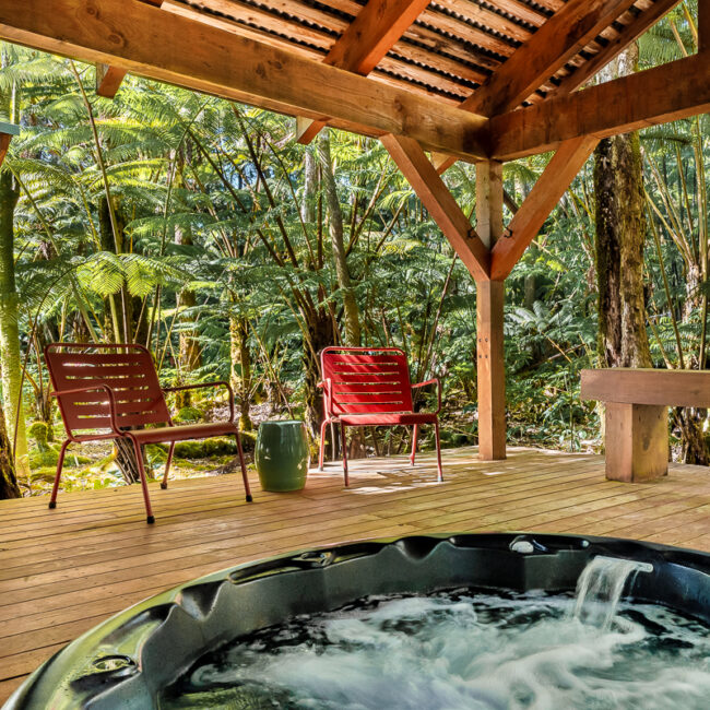 A favorite honeymoon suite with a rich yet soothing, contemplative organic look and feel with intimate rainforest views