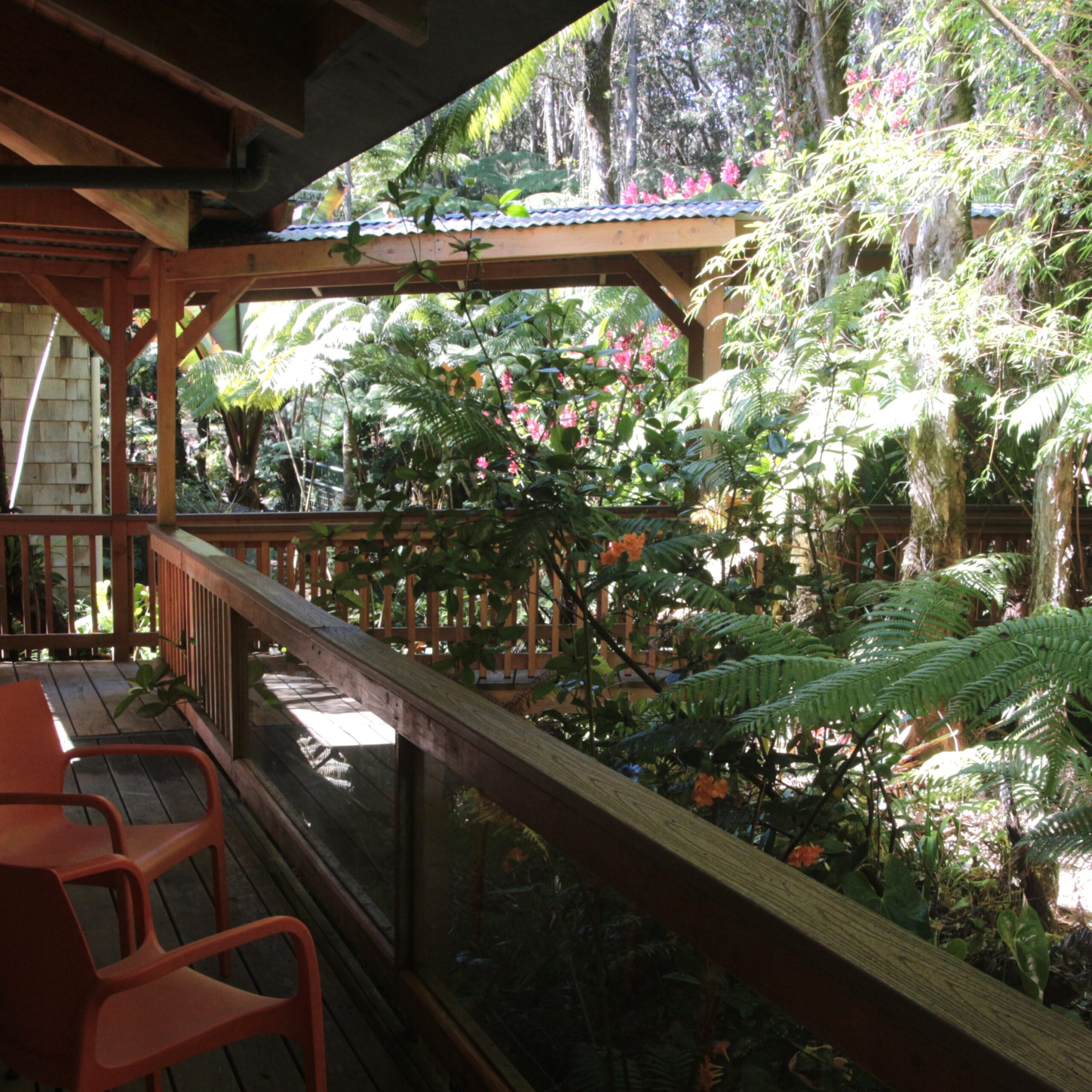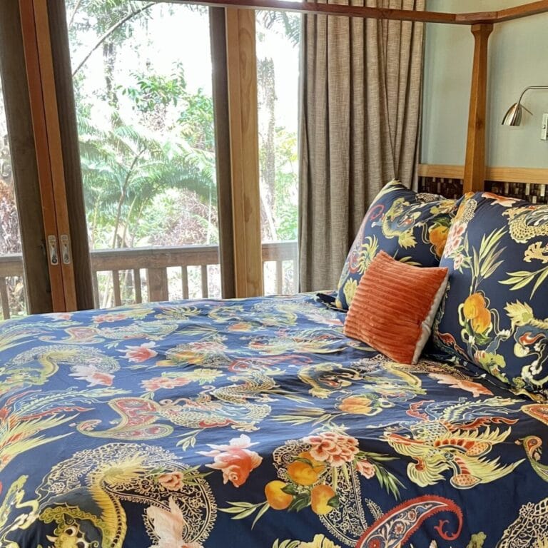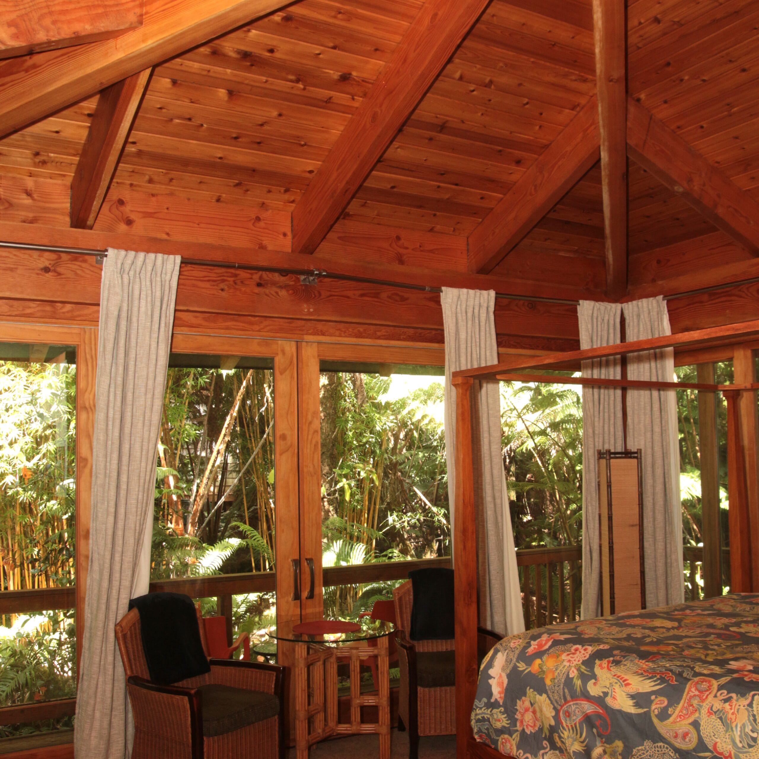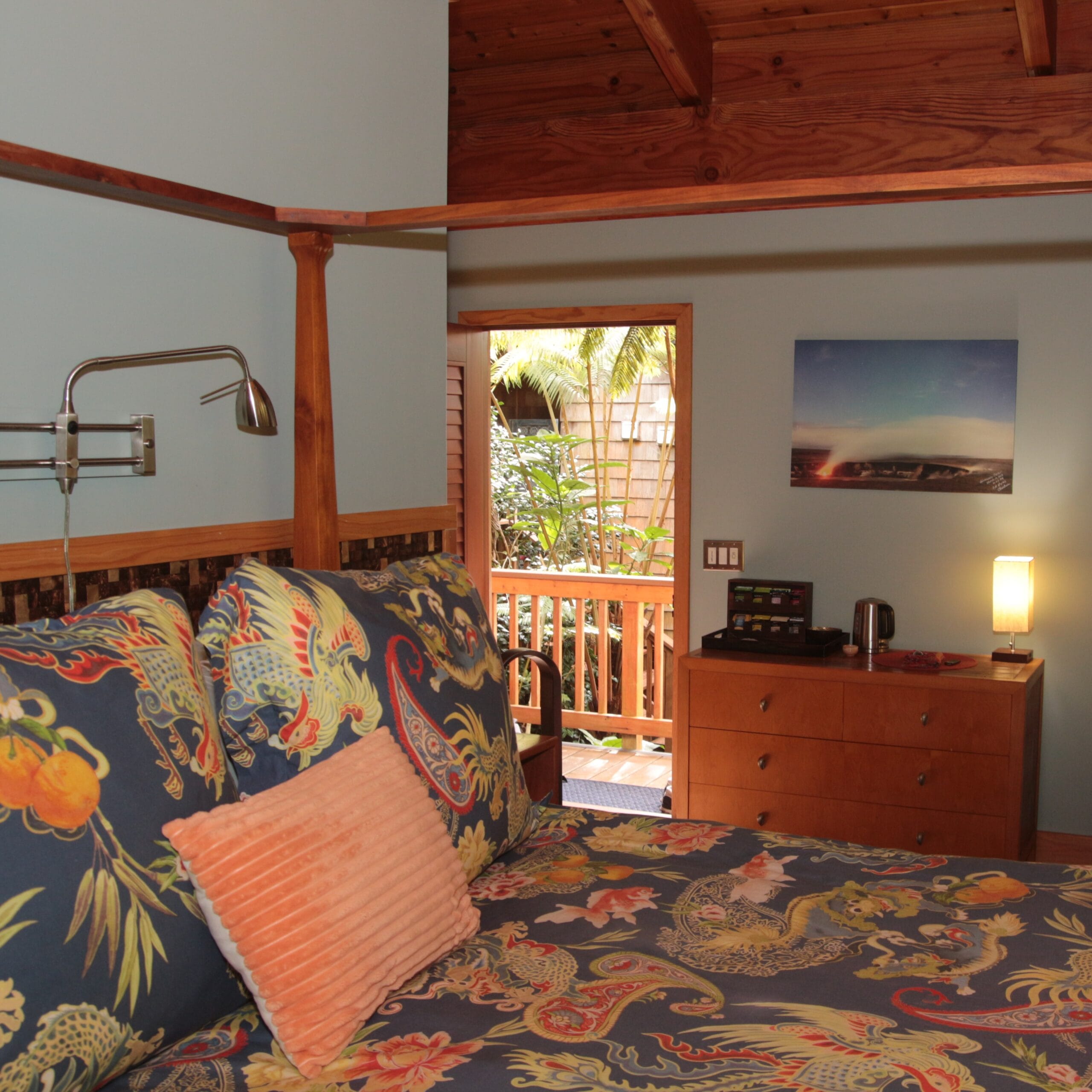 Wake up in a plush canopy king bed warmed with electric blankets on cool Volcano mornings. Enjoy a slow, quiet start to your day on your private lanai, sipping French-press, award-winning Hawaiian coffee while listening to birdsong drift through the forest.