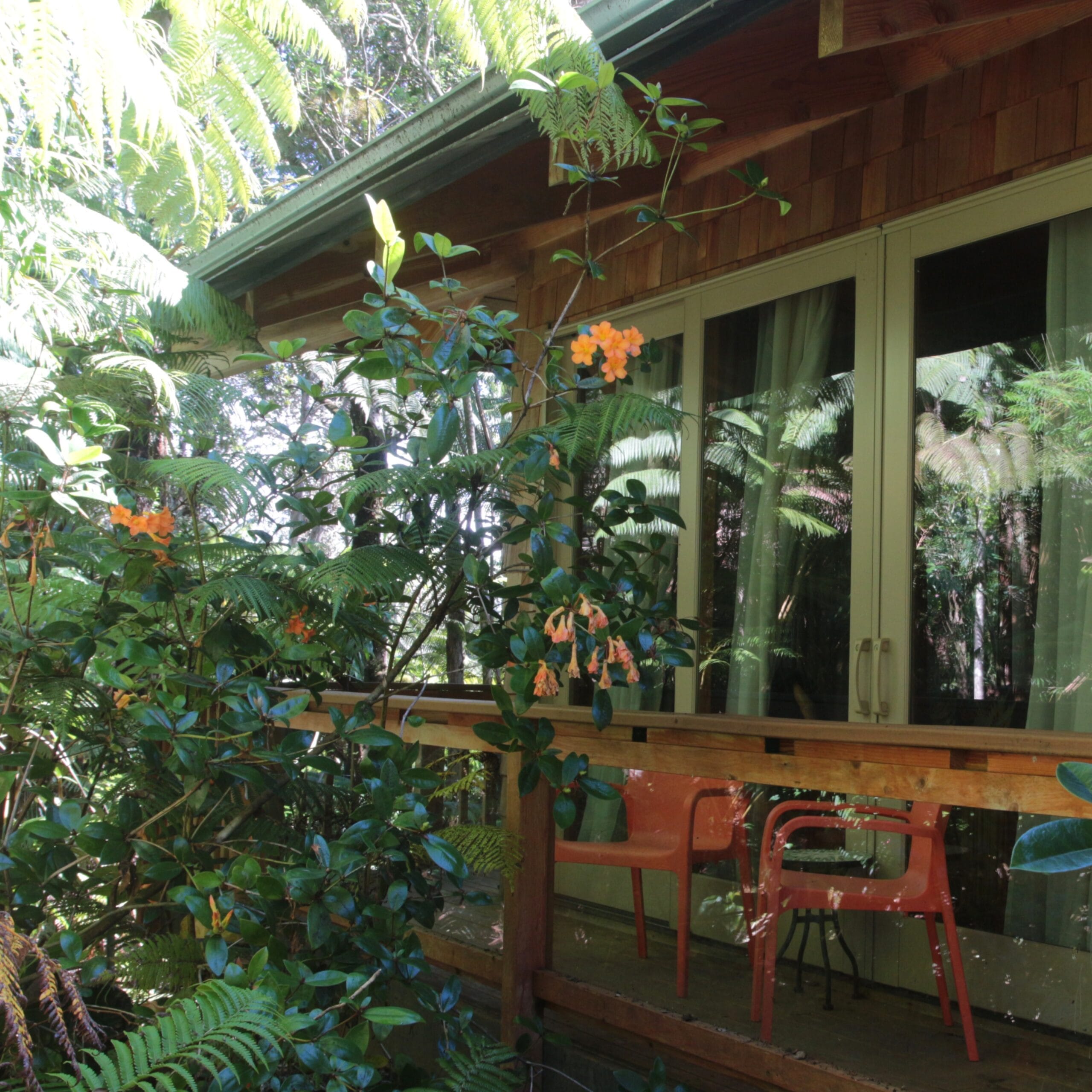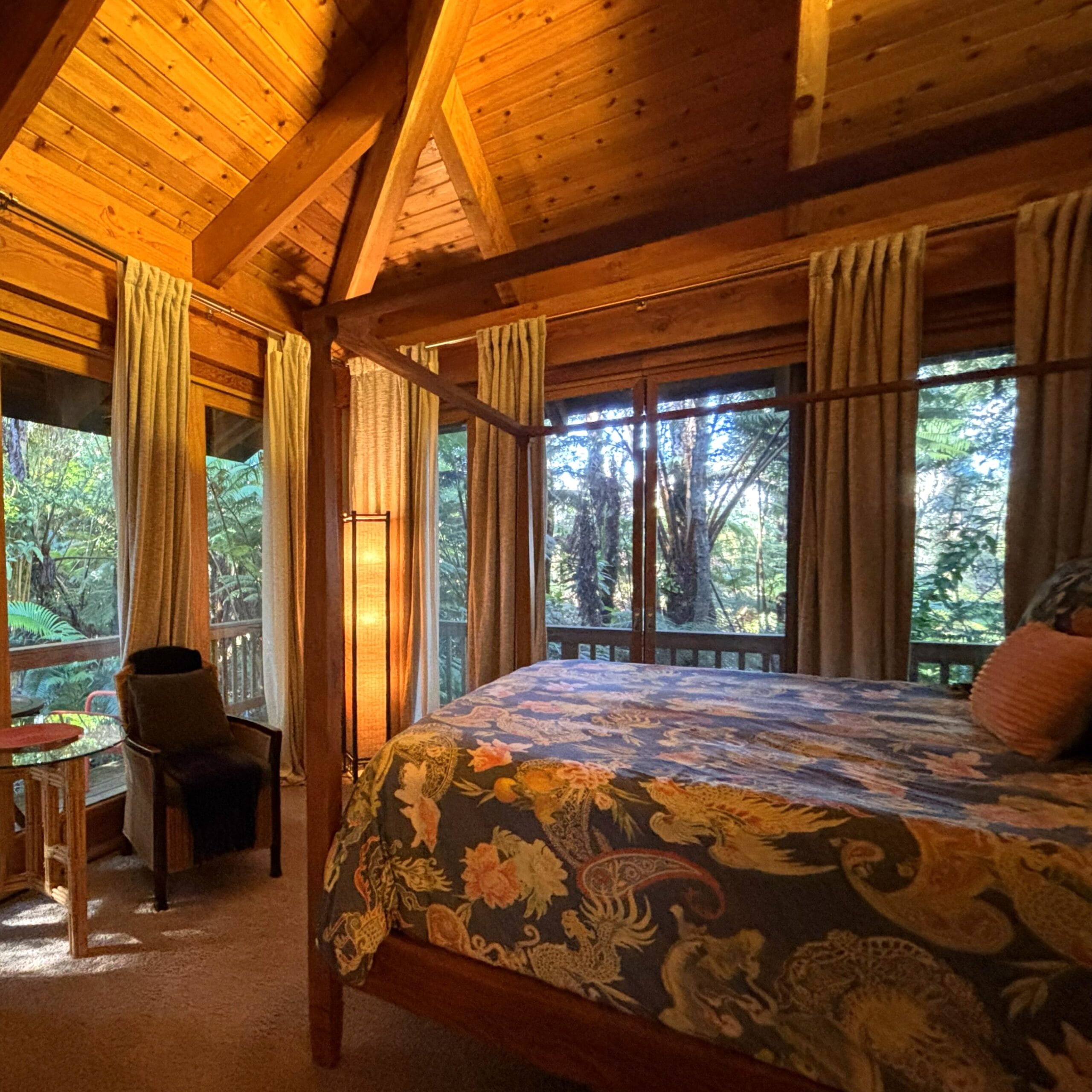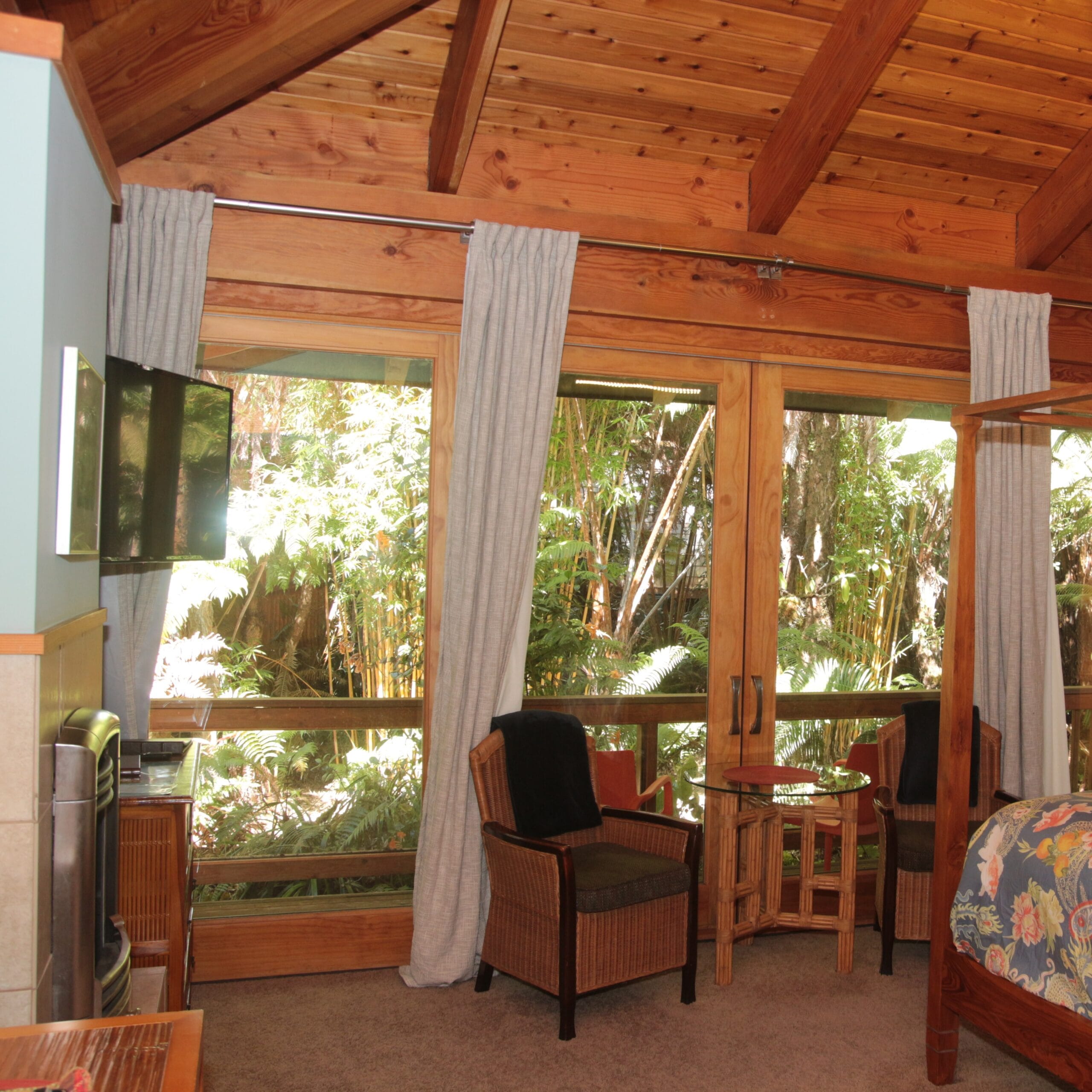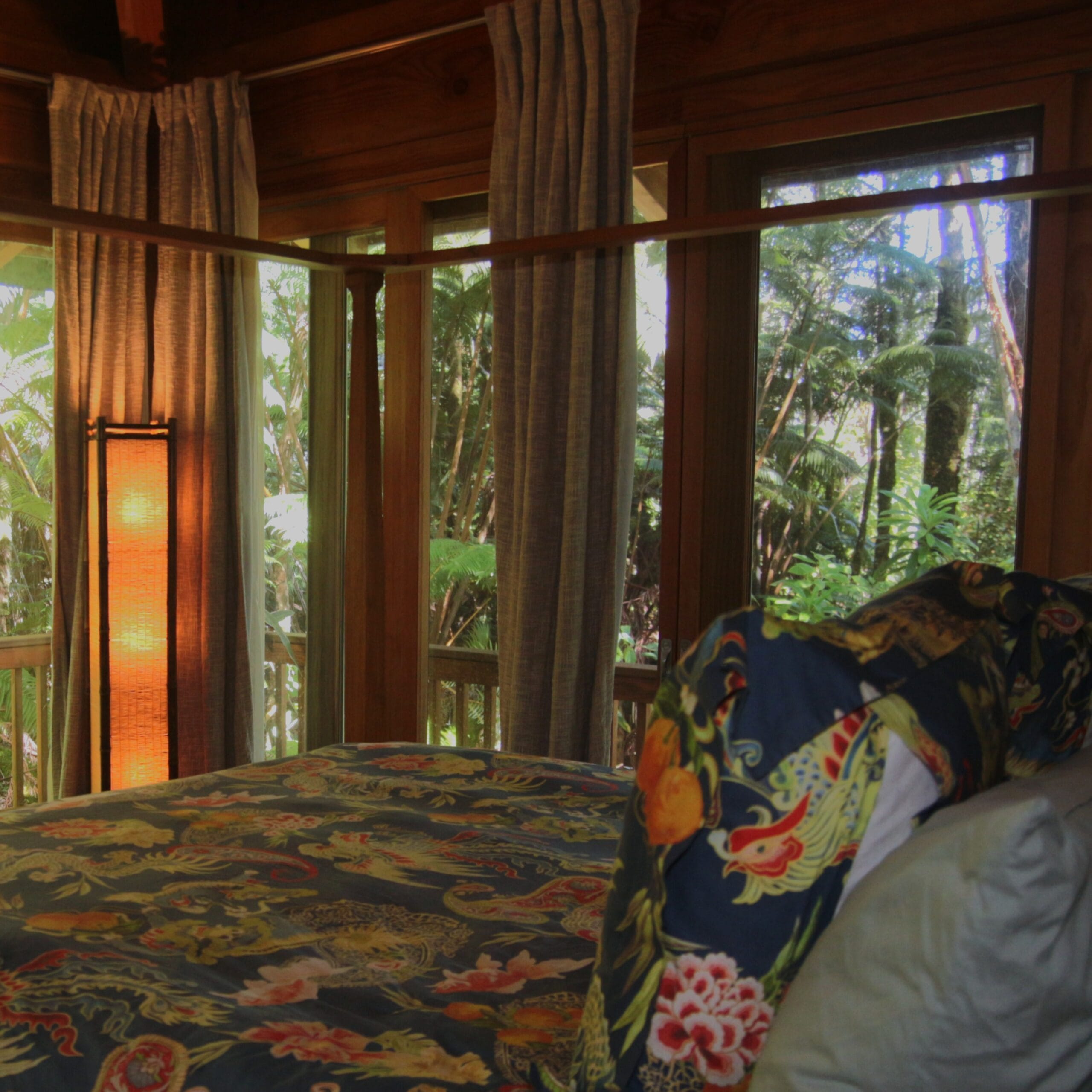 Wake up in a plush canopy king bed warmed with electric blankets on cool Volcano mornings. Enjoy a slow, quiet start to your day on your private lanai, sipping French-press, award-winning Hawaiian coffee while listening to birdsong drift through the forest.
