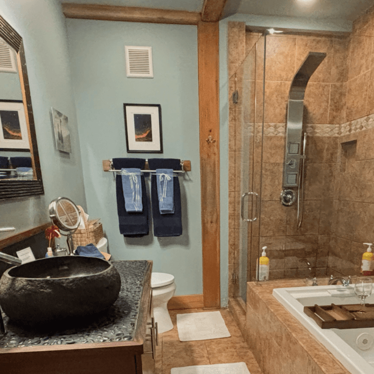After exploring Hawaiʻi Volcanoes National Park—located just minutes away—return to your suite and unwind by the gas fireplace, or indulge in the jetted soaking tub surrounded by natural light. The bathroom includes heated floors, a rainfall shower, and organic bath amenities sourced from local artisans.